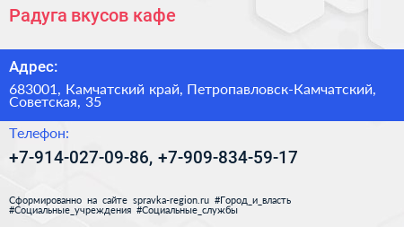 Радуга вкусов, кафе по адресу 683001, Камчатский край, Петропавловск-Камчатский, Советская, 35 в дальнейшем Организация, размещена в следующих категориях: