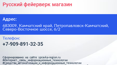 Русский фейерверк, магазин по адресу 683009, Камчатский край, Петропавловск-Камчатский, Северо-Восточное шоссе, 6/2 в дальнейшем Организация, размещена в следующих категориях: