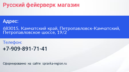 Русский фейерверк, магазин по адресу 683015, Камчатский край, Петропавловск-Камчатский, Петропавловское шоссе, 19/2 в дальнейшем Организация, размещена в следующих категориях: