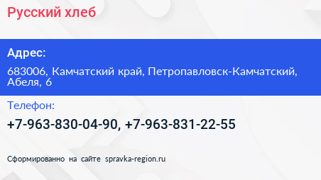 Русский хлеб по адресу 683006, Камчатский край, Петропавловск-Камчатский, Абеля, 6 в дальнейшем Организация, размещена в следующих категориях: