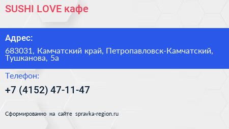 SUSHI LOVE, кафе по адресу 683031, Камчатский край, Петропавловск-Камчатский, Тушканова, 5а в дальнейшем Организация, размещена в следующих категориях: