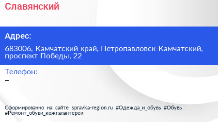 Славянский по адресу 683006, Камчатский край, Петропавловск-Камчатский, проспект Победы, 22 в дальнейшем Организация, размещена в следующих категориях: