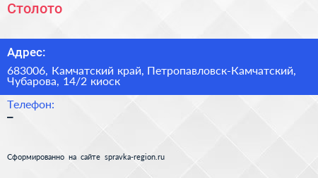 Столото по адресу 683006, Камчатский край, Петропавловск-Камчатский, Чубарова, 14/2 киоск в дальнейшем Организация, размещена в следующих категориях: