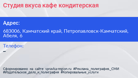 Студия вкуса, кафе-кондитерская по адресу 683006, Камчатский край, Петропавловск-Камчатский, Абеля, 6 в дальнейшем Организация, размещена в следующих категориях: