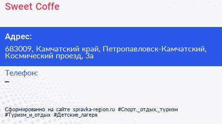 Sweet Coffe по адресу 683009, Камчатский край, Петропавловск-Камчатский, Космический проезд, 3а в дальнейшем Организация, размещена в следующих категориях: