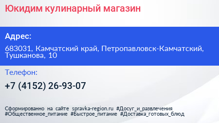 Юкидим, кулинарный магазин по адресу 683031, Камчатский край, Петропавловск-Камчатский, Тушканова, 10 в дальнейшем Организация, размещена в следующих категориях: