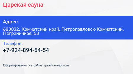 Царская, сауна по адресу 683032, Камчатский край, Петропавловск-Камчатский, Пограничная, 58 в дальнейшем Организация, размещена в следующих категориях:
