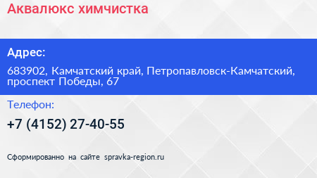 Аквалюкс, химчистка по адресу 683902, Камчатский край, Петропавловск-Камчатский, проспект Победы, 67 в дальнейшем Организация, размещена в следующих категориях: