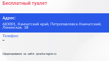 Бесплатный туалет по адресу 683001, Камчатский край, Петропавловск-Камчатский, Ленинская, 38 в дальнейшем Организация, размещена в следующих категориях: