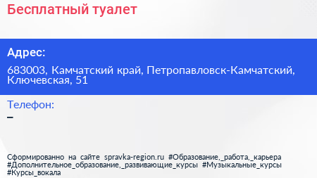 Бесплатный туалет по адресу 683003, Камчатский край, Петропавловск-Камчатский, Ключевская, 51 в дальнейшем Организация, размещена в следующих категориях: