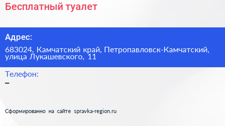 Бесплатный туалет по адресу 683024, Камчатский край, Петропавловск-Камчатский, улица Лукашевского, 11 в дальнейшем Организация, размещена в следующих категориях: