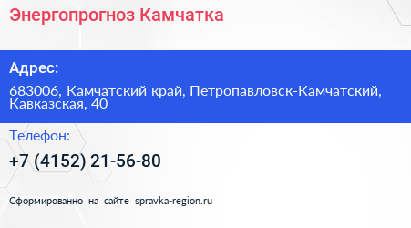 Энергопрогноз-Камчатка по адресу 683006, Камчатский край, Петропавловск-Камчатский, Кавказская, 40 в дальнейшем Организация, размещена в следующих категориях: