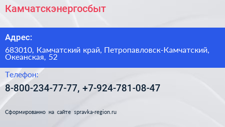 Камчатскэнергосбыт по адресу 683010, Камчатский край, Петропавловск-Камчатский, Океанская, 52 в дальнейшем Организация, размещена в следующих категориях: