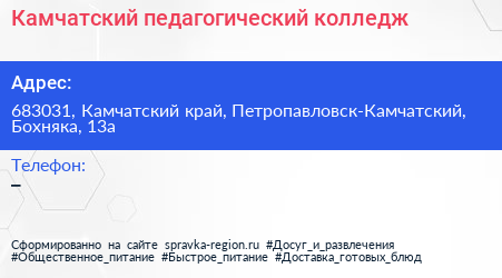 Камчатский педагогический колледж по адресу 683031, Камчатский край, Петропавловск-Камчатский, Бохняка, 13а в дальнейшем Организация, размещена в следующих категориях: