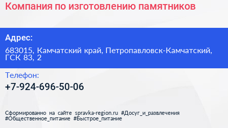 Компания по изготовлению памятников по адресу 683015, Камчатский край, Петропавловск-Камчатский, ГСК 83, 2 в дальнейшем Организация, размещена в следующих категориях: