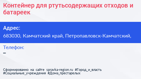 Контейнер для ртутьсодержащих отходов и батареек по адресу 683030, Камчатский край, Петропавловск-Камчатский, в дальнейшем Организация, размещена в следующих категориях: