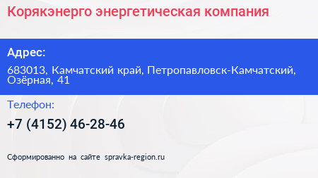 Корякэнерго, энергетическая компания по адресу 683013, Камчатский край, Петропавловск-Камчатский, Озёрная, 41 в дальнейшем Организация, размещена в следующих категориях: