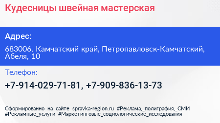 Кудесницы, швейная мастерская по адресу 683006, Камчатский край, Петропавловск-Камчатский, Абеля, 10 в дальнейшем Организация, размещена в следующих категориях:
