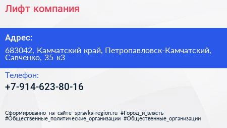 Лифт, компания по адресу 683042, Камчатский край, Петропавловск-Камчатский, Савченко, 35 к3 в дальнейшем Организация, размещена в следующих категориях: