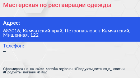 Мастерская по реставрации одежды по адресу 683016, Камчатский край, Петропавловск-Камчатский, Мишенная, 122 в дальнейшем Организация, размещена в следующих категориях: