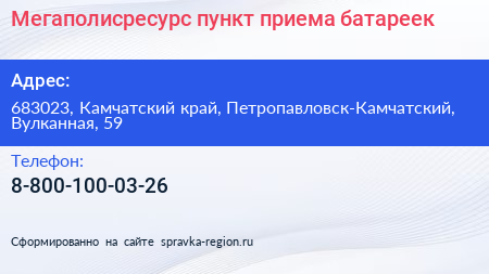 Мегаполисресурс, пункт приема батареек по адресу 683023, Камчатский край, Петропавловск-Камчатский, Вулканная, 59 в дальнейшем Организация, размещена в следующих категориях: