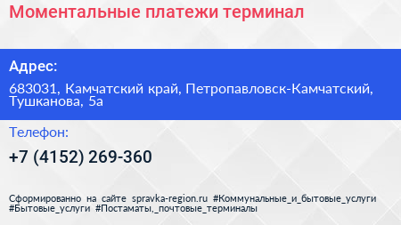 Моментальные платежи, терминал по адресу 683031, Камчатский край, Петропавловск-Камчатский, Тушканова, 5а в дальнейшем Организация, размещена в следующих категориях: