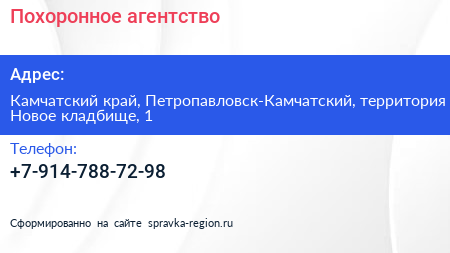 Похоронное агентство по адресу Камчатский край, Петропавловск-Камчатский, территория Новое кладбище, 1 в дальнейшем Организация, размещена в следующих категориях: