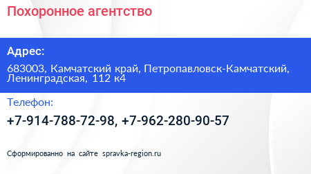 Похоронное агентство по адресу 683003, Камчатский край, Петропавловск-Камчатский, Ленинградская, 112 к4 в дальнейшем Организация, размещена в следующих категориях: