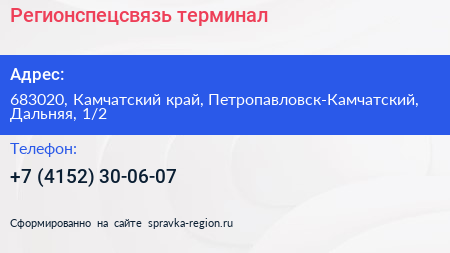 Регионспецсвязь, терминал по адресу 683020, Камчатский край, Петропавловск-Камчатский, Дальняя, 1/2 в дальнейшем Организация, размещена в следующих категориях: