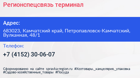 Регионспецсвязь, терминал по адресу 683023, Камчатский край, Петропавловск-Камчатский, Вулканная, 48/1 в дальнейшем Организация, размещена в следующих категориях: