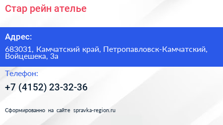 Стар рейн, ателье по адресу 683031, Камчатский край, Петропавловск-Камчатский, Войцешека, 3а в дальнейшем Организация, размещена в следующих категориях: