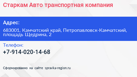 Старкам-Авто, транспортная компания по адресу 683001, Камчатский край, Петропавловск-Камчатский, площадь Щедрина, 2 в дальнейшем Организация, размещена в следующих категориях: