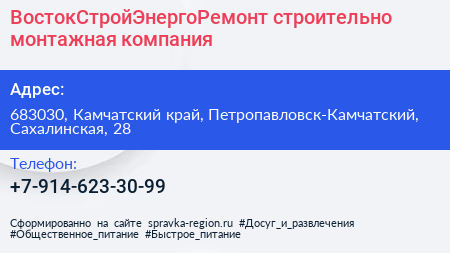 ВостокСтройЭнергоРемонт, строительно-монтажная компания по адресу 683030, Камчатский край, Петропавловск-Камчатский, Сахалинская, 28 в дальнейшем Организация, размещена в следующих категориях: