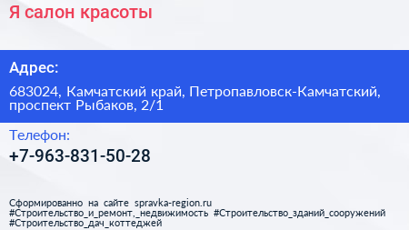 Я, салон красоты по адресу 683024, Камчатский край, Петропавловск-Камчатский, проспект Рыбаков, 2/1 в дальнейшем Организация, размещена в следующих категориях: