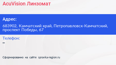 AcuVision, Линзомат по адресу 683902, Камчатский край, Петропавловск-Камчатский, проспект Победы, 67 в дальнейшем Организация, размещена в следующих категориях: