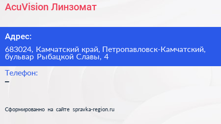 AcuVision, Линзомат по адресу 683024, Камчатский край, Петропавловск-Камчатский, бульвар Рыбацкой Славы, 4 в дальнейшем Организация, размещена в следующих категориях: