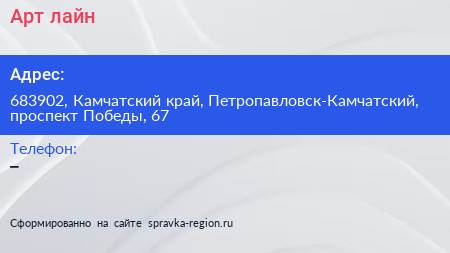 Арт-лайн по адресу 683902, Камчатский край, Петропавловск-Камчатский, проспект Победы, 67 в дальнейшем Организация, размещена в следующих категориях: