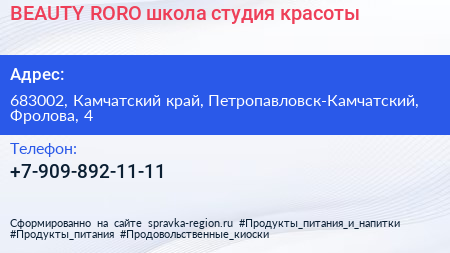BEAUTY RORO, школа-студия красоты по адресу 683002, Камчатский край, Петропавловск-Камчатский, Фролова, 4 в дальнейшем Организация, размещена в следующих категориях: