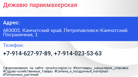 Дежавю, парикмахерская по адресу 683003, Камчатский край, Петропавловск-Камчатский, Пограничная, 1 в дальнейшем Организация, размещена в следующих категориях: