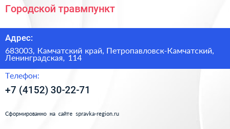 Городской травмпункт по адресу 683003, Камчатский край, Петропавловск-Камчатский, Ленинградская, 114 в дальнейшем Организация, размещена в следующих категориях: