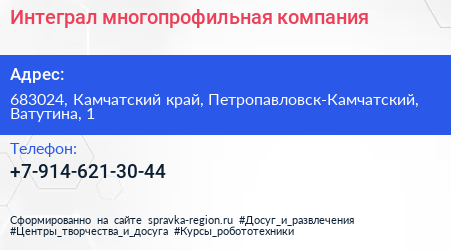 Интеграл, многопрофильная компания по адресу 683024, Камчатский край, Петропавловск-Камчатский, Ватутина, 1 в дальнейшем Организация, размещена в следующих категориях: