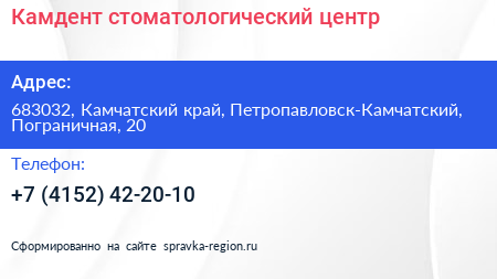 Камдент, стоматологический центр по адресу 683032, Камчатский край, Петропавловск-Камчатский, Пограничная, 20 в дальнейшем Организация, размещена в следующих категориях: