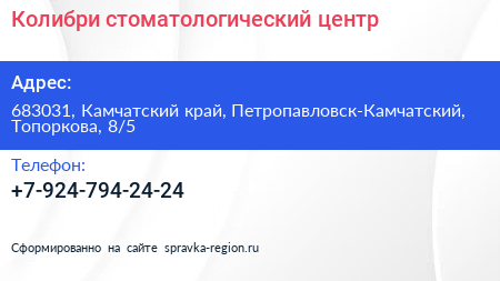 Колибри, стоматологический центр по адресу 683031, Камчатский край, Петропавловск-Камчатский, Топоркова, 8/5 в дальнейшем Организация, размещена в следующих категориях: