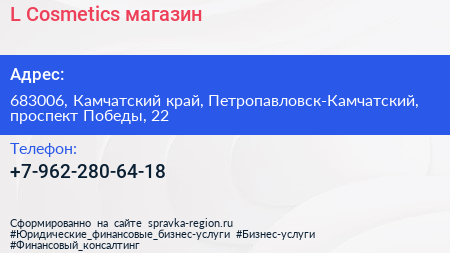 L`Cosmetics, магазин по адресу 683006, Камчатский край, Петропавловск-Камчатский, проспект Победы, 22 в дальнейшем Организация, размещена в следующих категориях: