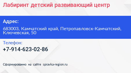 Лабиринт, детский развивающий центр по адресу 683003, Камчатский край, Петропавловск-Камчатский, Ключевская, 50 в дальнейшем Организация, размещена в следующих категориях: