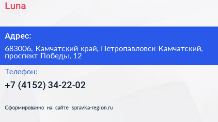 Luna по адресу 683006, Камчатский край, Петропавловск-Камчатский, проспект Победы, 12 в дальнейшем Организация, размещена в следующих категориях: