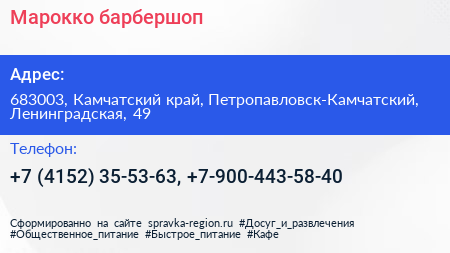 Марокко, барбершоп по адресу 683003, Камчатский край, Петропавловск-Камчатский, Ленинградская, 49 в дальнейшем Организация, размещена в следующих категориях:
