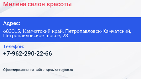 Милена, салон красоты по адресу 683015, Камчатский край, Петропавловск-Камчатский, Петропавловское шоссе, 23 в дальнейшем Организация, размещена в следующих категориях: