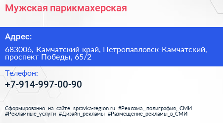 Мужская парикмахерская по адресу 683006, Камчатский край, Петропавловск-Камчатский, проспект Победы, 65/2 в дальнейшем Организация, размещена в следующих категориях: