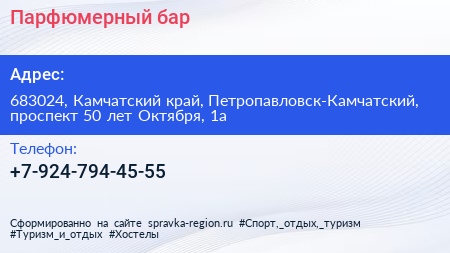 Парфюмерный бар по адресу 683024, Камчатский край, Петропавловск-Камчатский, проспект 50 лет Октября, 1а в дальнейшем Организация, размещена в следующих категориях: